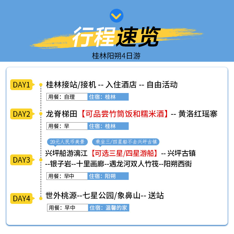 本产品科学规划路线,4天内串联漓江精华段、阳朔遇龙河、银子岩溶洞及龙脊梯田,避免重复折返,最大化利用差旅碎片时间。全程交通、门票、住宿一站式安排,省去自行规划的繁琐,让商务出行者轻松实现‘说走就走’的度假体验。