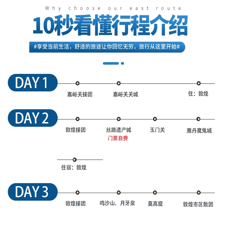 精心设计3天2晚行程,覆盖敦煌、嘉峪关、酒泉核心景点,节奏张弛有度。第一天下午集合,第三天中午前结束,便于衔接晚间航班或高铁返程,确保差旅人士既能深度游玩,又不影响后续工作安排,真正实现‘说走就走’的高效度假。