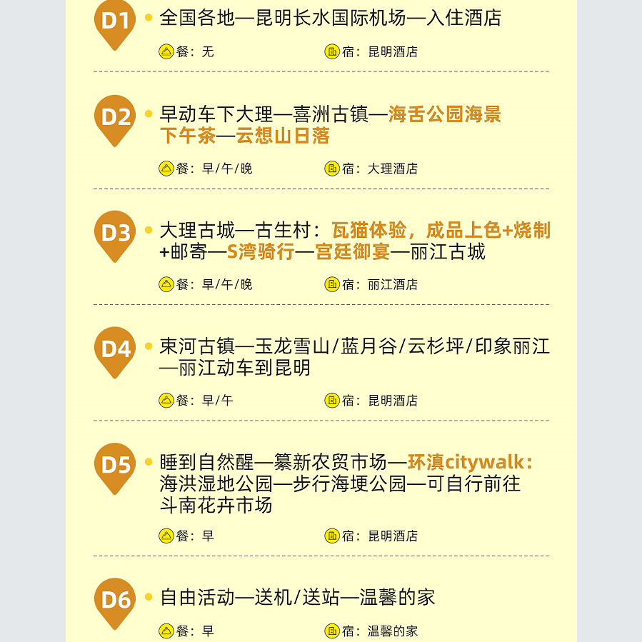 针对差旅人士常见的3-7天碎片化假期,精心规划6天5晚行程,覆盖昆明、大理、丽江三大经典目的地。白天游览石林、洱海、玉龙雪山等核心景点,晚上入住四钻酒店保障休息质量。全程交通、住宿、门票一价全含,省去繁琐安排,让您在有限时间内最大化享受云南风光,回归工作时精力充沛。