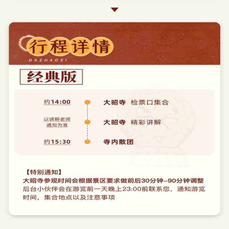 充分理解差旅计划常因会议调整、航班变更而临时取消,本产品提供清晰透明的退改政策:行程前1日0点前取消免手续费,12点前仅收10%,最大限度降低您的决策风险。同时,若商家原因导致行程取消,最高可获100%违约金补偿。这种灵活可靠的保障机制,让差旅人士敢订、敢约,无后顾之忧地规划文化体验。