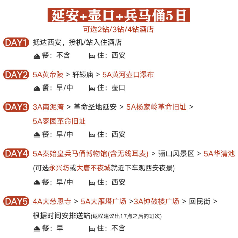 本产品不仅涵盖西安经典景点,更延伸至革命圣地延安,带您探访红色历史足迹。从合肥、南昌、贵阳等城市出发的旅客,可在一次行程中同时领略古代帝都与近代革命圣地的双重文化内涵。行程交通由专业旅游巴士保障,免除异地转乘烦恼,让差旅后的延展旅行更加安心顺畅。