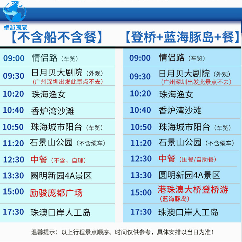行程巧妙结合珠海都市地标(日月贝歌剧院、圆明新园)与蓝海豚岛自然风光,满足差旅人士对文化、历史与海滨休闲的多重需求。上午在仿古园林感受岭南文化,下午于海岛栈道吹拂海风,有效缓解高强度工作压力。这种‘城市-海洋’双场景切换模式,特别适合需要快速恢复精力的商务客群,在有限时间内实现身心双重充电。