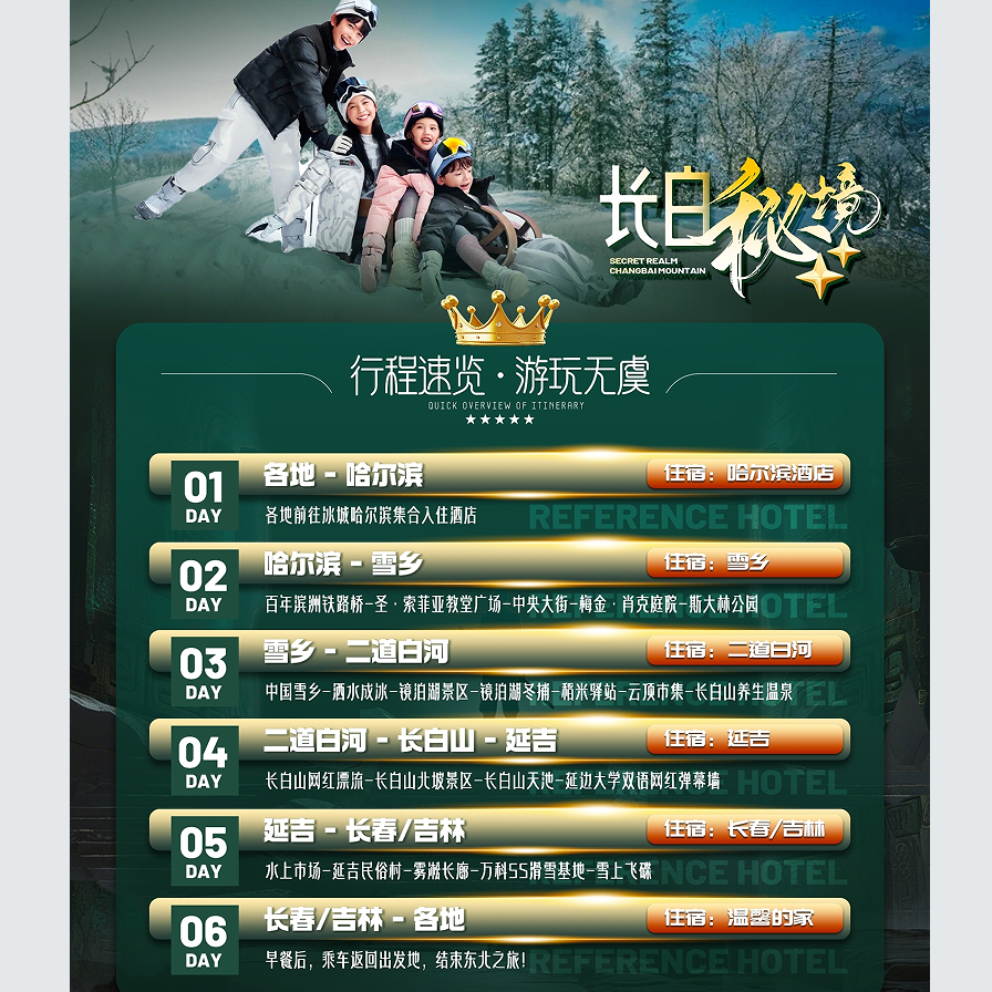 本线路专为来自广州、北京、深圳、上海、杭州、成都等全国28个主要城市差旅人士设计,提供含往返机票的6天深度冰雪之旅。无论您刚结束一场紧张的商务会议,还是完成项目交付,均可从所在城市直飞哈尔滨,无需中转,高效衔接工作与度假。行程涵盖长白山天池、雪乡童话世界、延吉朝鲜族风情及万科滑雪场,让您在高效差旅之后,迅速切换至放松模式,享受北国风光的独特魅力。
