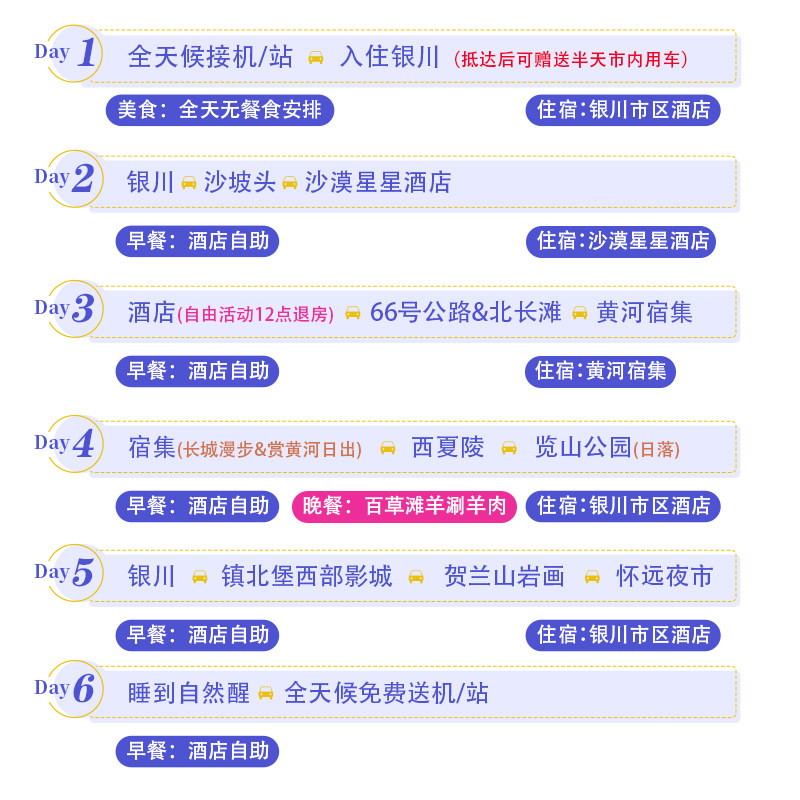 本行程专为差旅人士设计,从银川出发无缝衔接中卫目的地,两地同属宁夏回族自治区,交通便捷、车程合理,极大节省差旅途中转时间。无论是商务会议后的放松之旅,还是项目考察间隙的休闲调剂,6日私家团行程节奏张弛有度,兼顾效率与体验,让差旅不再只是奔波,而是融合工作与度假的高品质旅程。