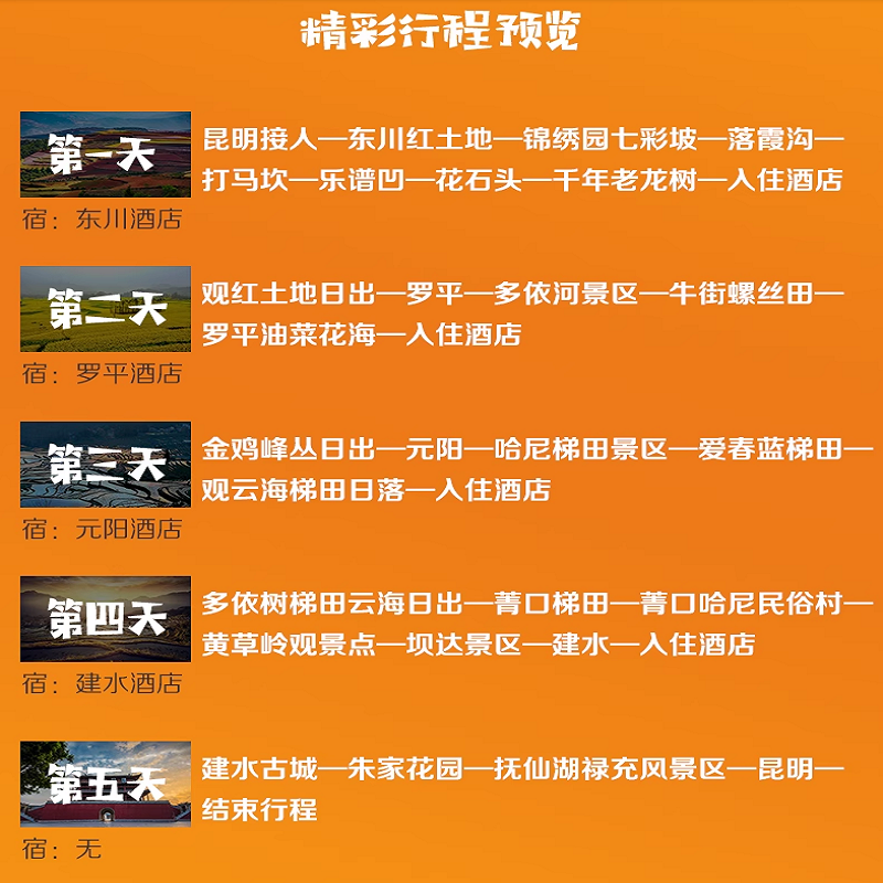 本行程以昆明为起点,高效串联红河、玉溪、曲靖等云南核心区域,特别适合商务差旅后顺道度假的旅客。从昆明便捷出发,5日内深度游览东川红土地、罗平油菜花海、元阳梯田、建水古城与抚仙湖,既满足高效差旅节奏,又无缝衔接自然与人文体验,实现工作与休闲的完美平衡。