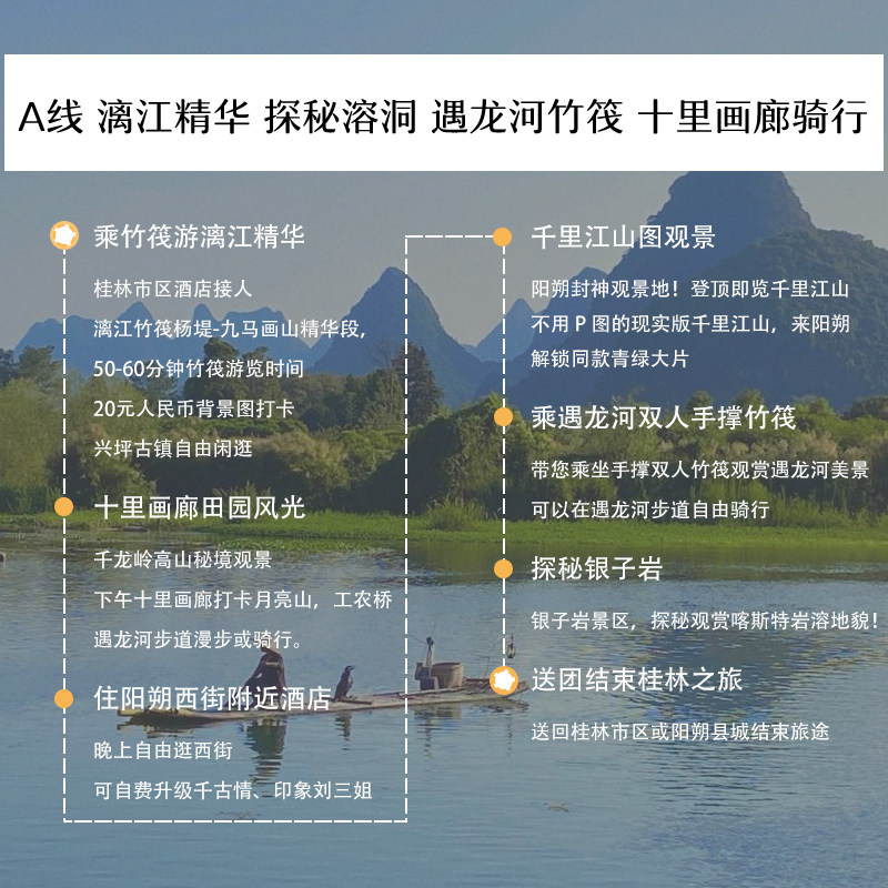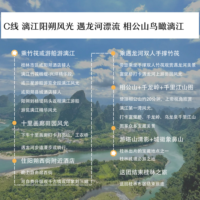 本产品支持1人单独预订,无需拼团等待,特别适合商务人士或独自出差后顺道度假的旅客。无论您是临时决定放松身心,还是在桂林差旅间隙安排短途旅行,都能即刻成行,省去协调多人时间的麻烦,让您的差旅与休闲无缝衔接,提升出行效率与体验感。
