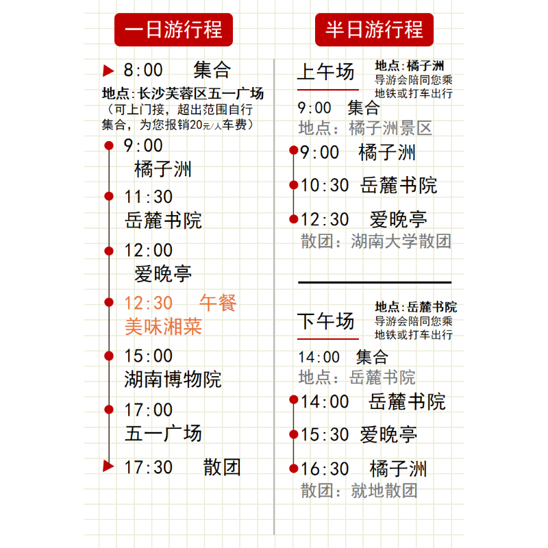 即便独自出差,也能轻松安排亲子时光!本线路支持1人预订,无需拼团,灵活适配差旅节奏。行程中融入亲子互动环节,在湖南博物院参与文物小课堂,在橘子洲草坪开展趣味探索,在岳麓书院体验国学启蒙,让孩子在行走中学习历史。全程配备专业讲解与儿童友好设施,解决差旅家长兼顾工作与陪伴的难题,让短暂相聚充满意义。