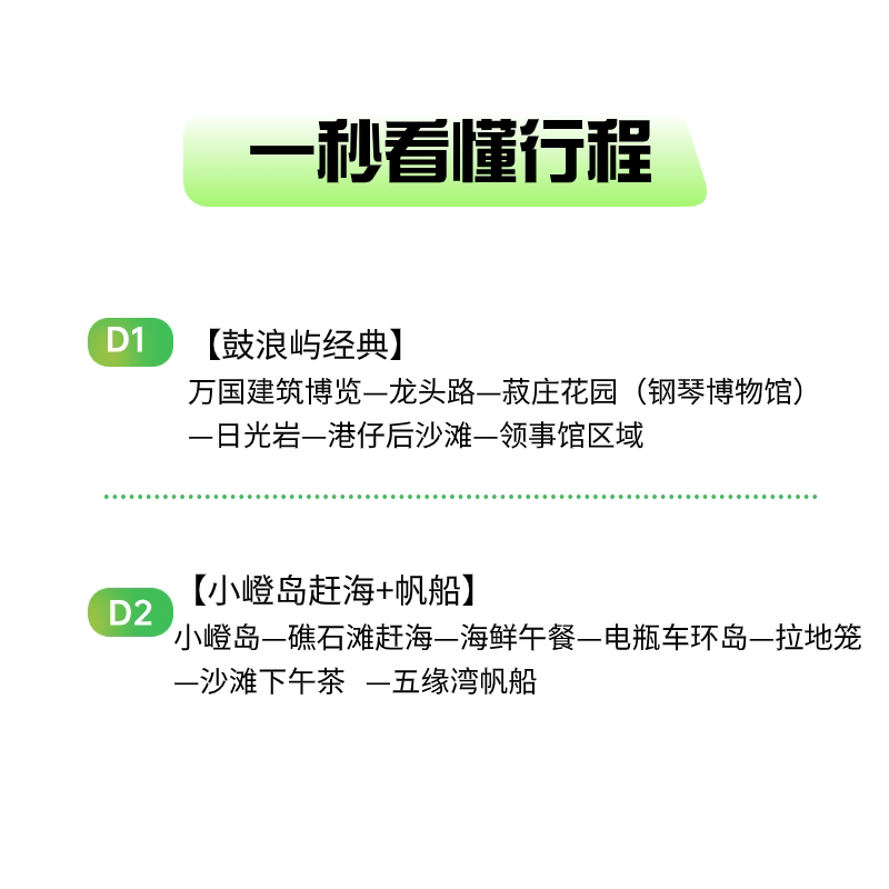 针对时间紧张的差旅人群,精心压缩行程至2天1晚,覆盖鼓浪屿世界文化遗产与小嶝岛原生态渔村两大核心体验。无需请假多日,周末或工作间隙即可完成一次深度度假。全程纯玩无购物,省去无效耗时,确保每一分钟都用于真正放松与探索,是高效差旅人士的理想选择。