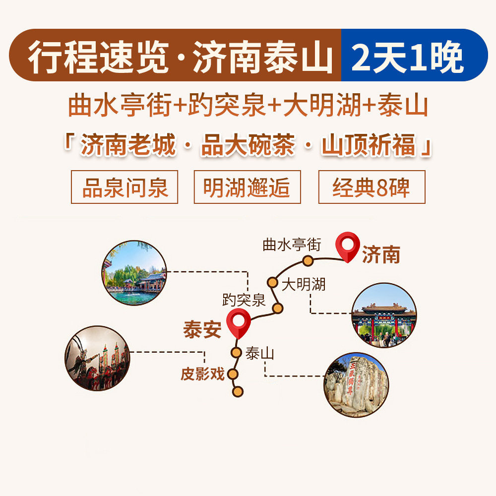 本行程专为差旅人士设计,从济南市区出发,无缝衔接泰山登顶祈福与趵突泉、大明湖等核心景点游览。全程交通便捷,时间安排紧凑合理,既满足商务出行后的放松需求,又兼顾文化体验。特别适合出差间隙或周末短途度假的旅客,无需额外规划路线,专业导游全程讲解,让差旅之余也能深度感受齐鲁文化魅力。