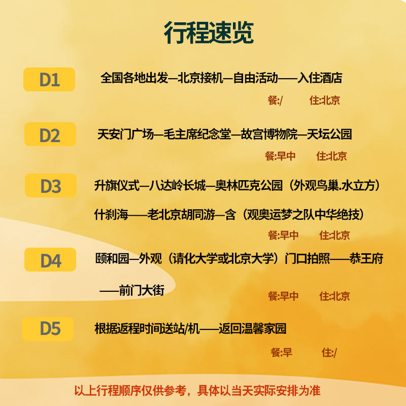 本行程专为来自山西及内蒙古多地(包括太原、临汾、吕梁、长治、运城、包头、鄂尔多斯、呼和浩特、通辽)的差旅人士设计,提供便捷的5天4晚北京跟团游。无论您是结束商务会议后想快速切换至度假模式,还是利用周末延展一次文化之旅,该线路均可实现无缝衔接。全程交通、住宿、门票一站式安排,节省您自行规划的时间成本,让您在紧凑日程中也能深度体验首都魅力。