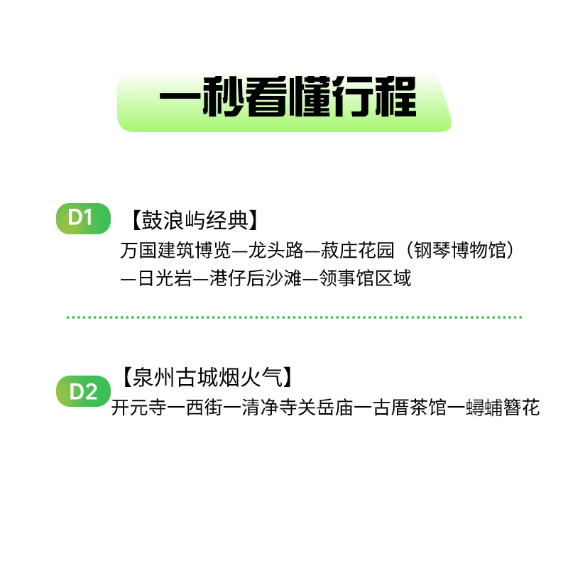 专为时间紧张的差旅人士设计,2天1晚紧凑行程高效覆盖厦门鼓浪屿、环岛路与泉州西街、开元寺两大核心城市精华景点。交通接驳顺畅,避免冗余转场,最大化利用碎片化假期。无论您是从厦门出发或返程,均可灵活嵌入既有差旅行程,实现工作与休闲的完美平衡,真正做到‘出差顺带度假’。