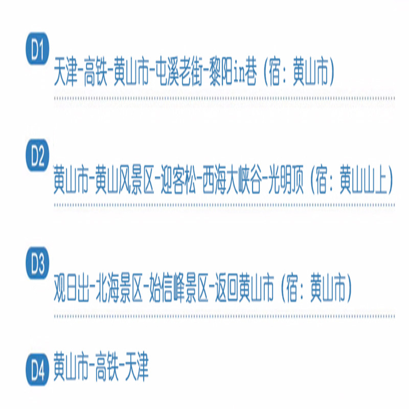 本行程专为差旅人士设计,从天津出发乘坐高铁快速抵达黄山,全程交通无缝衔接,大幅压缩路途时间。高铁舒适便捷,让您在繁忙工作之余轻松切换至度假模式。抵达后即由专业导游接应,无需操心换乘与路线规划,真正实现“说走就走”的高效差旅度假体验,兼顾效率与放松。