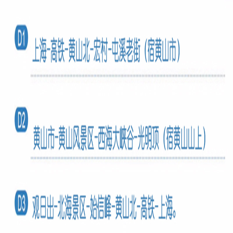 专为时间宝贵的差旅人群设计,3天2晚行程充分利用周五晚至周日的时间窗口,或调休一天即可完成一次深度度假。首日高铁抵达后直上黄山,次日观日出、游宏村,第三日返程,节奏张弛有度。无需冗长假期,也能收获世界级自然与人文景观的双重滋养,提升差旅生活的品质感。