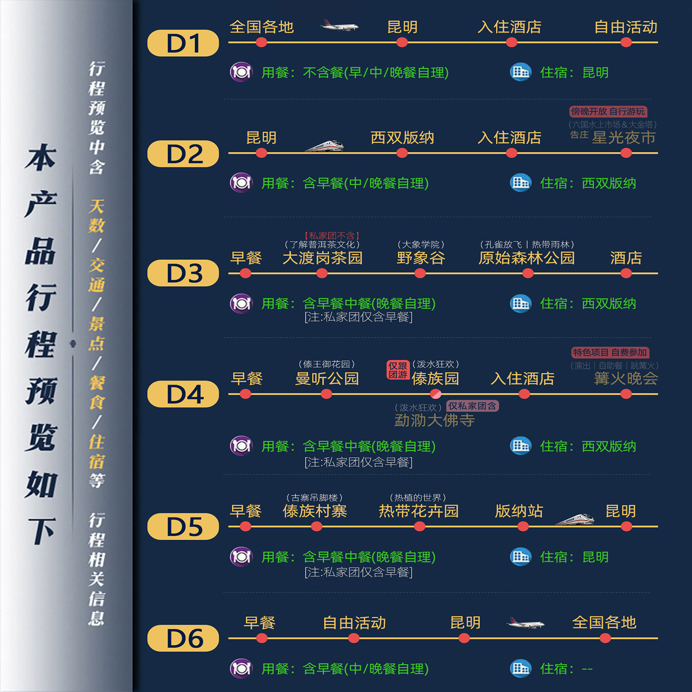 支持1人即可成团预订,打破传统跟团游对人数的限制,非常适合独自出差或临时决定延长假期的商务人士。无需等待拼团,随时下单即可开启6日纯玩之旅,在完成工作任务之余,沉浸于西双版纳的热带风情与民族文化之中,真正实现‘说走就走’的差旅休闲融合体验。