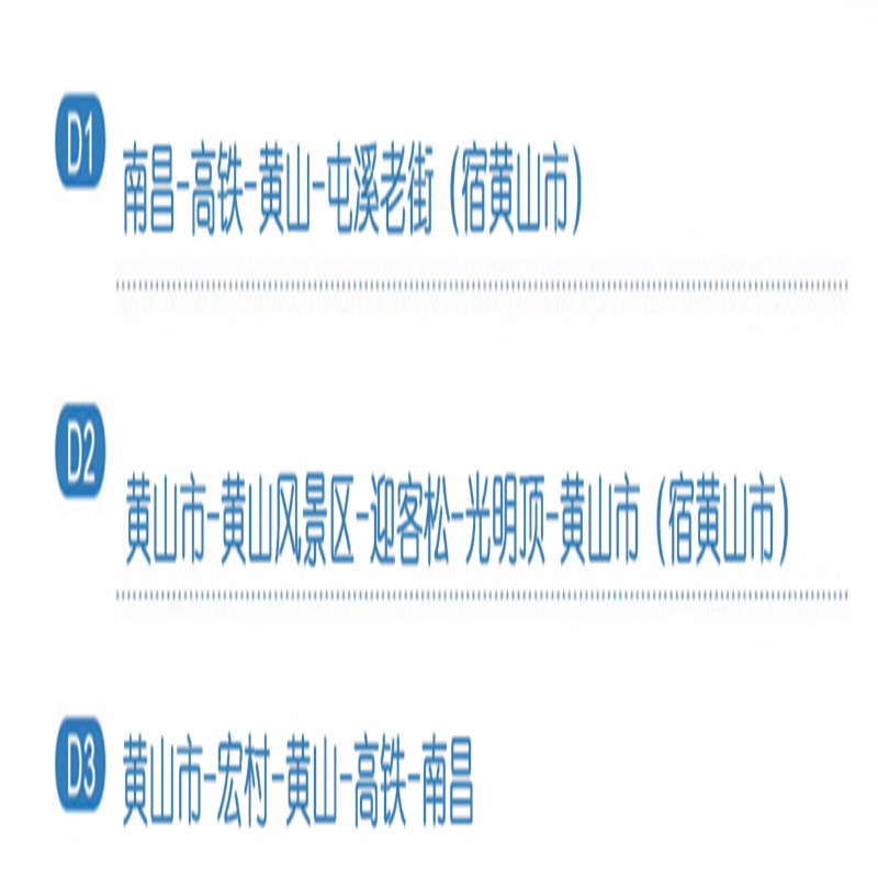 本行程专为差旅人士设计,从南昌出发乘坐高铁仅需约2.5小时即可抵达黄山北站,交通高效便捷,大幅节省路途时间。高铁班次密集,便于根据工作安排灵活选择出发时间,实现商务与休闲的无缝衔接。抵达后专车接站,全程无忧,让您快速进入度假状态,真正实现‘说走就走’的差旅式微度假体验。