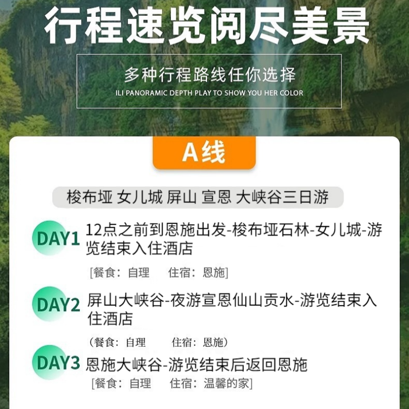 产品提供A至H共8种套餐选择,可根据抵达时间(12点或14点前)及兴趣偏好(侧重峡谷、溶洞或文化)灵活搭配。差旅人士无需受限于固定线路,能快速匹配自身空闲时段与兴趣点,实现个性化微度假,真正体现‘说走就走’的差旅自由度。