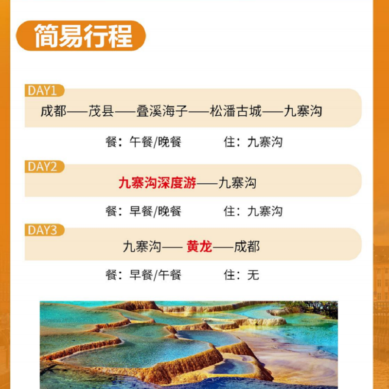 专为时间宝贵的差旅人群设计,全程“纯玩无购物”,杜绝无效停留和推销干扰。三天行程精准覆盖九寨沟、黄龙、都江堰、熊猫基地四大核心IP,路线规划科学,减少车程浪费。您可在最短时间内沉浸于彩林碧水、雪山圣湖与古堰智慧之中,实现高效度假与深度体验的完美平衡。