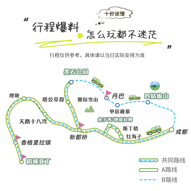 产品以成都为起点,方便搭乘高铁或航班抵达的差旅人士直接开启旅程。无需额外中转或长时间等待,当天即可踏上川西大环线,高效利用周末或会议结束后的空闲时间,实现工作与旅行的无缝切换,最大化您的宝贵假期。