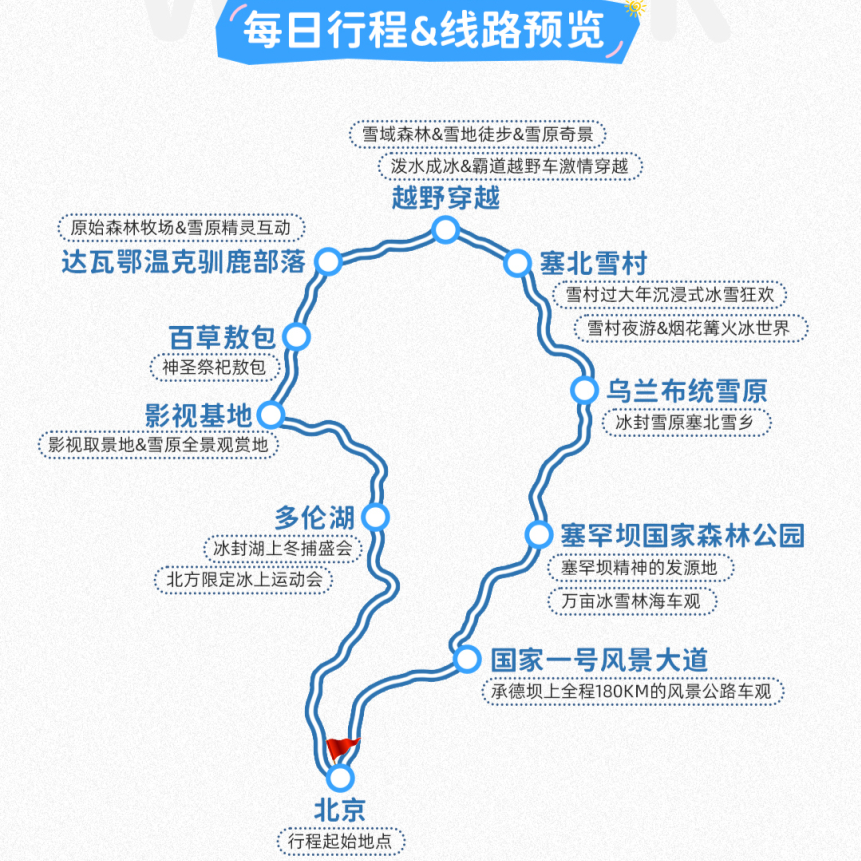 本线路支持1人独立预订,无需拼团等待,特别适合商务人士或独自出差途中希望顺道放松的旅客。从北京出发,3天2晚紧凑行程无缝衔接工作与休闲,既满足差旅效率需求,又提供沉浸式冰雪体验,让短暂假期也能收获满满回忆。
