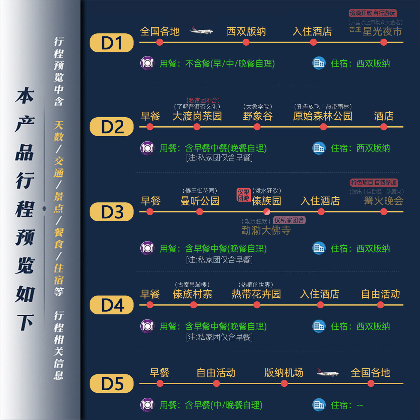 本线路支持1人即可成团预订,特别适合商务差旅人士在完成工作任务后无缝衔接休闲度假。无需等待拼团,行程安排灵活,节省时间成本。无论是独自出差后的放松之旅,还是临时起意的周末逃离,都能即刻启程,享受西双版纳热带风情与民族文化交融的独特体验。