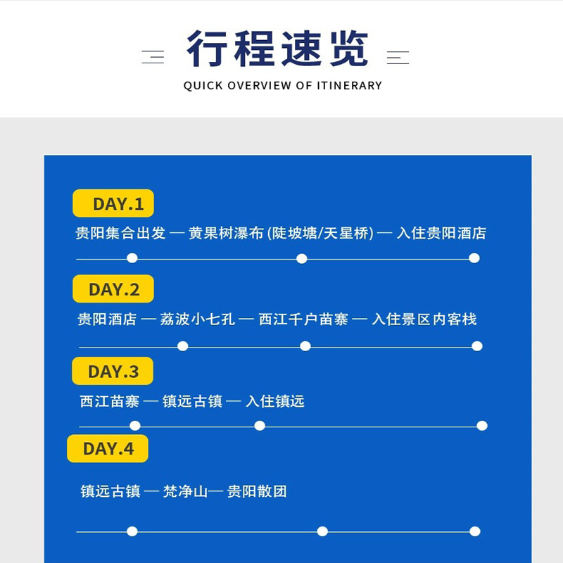 专为时间宝贵的差旅人群设计,4天3晚行程节奏张弛有度——既涵盖贵州最具代表性的自然与人文景观,又避免过度赶路。每日车程合理分配,住宿安排舒适便捷,确保白天高效游览、夜晚充分休息。适合利用周末+两天年假或项目间隙完成一次高质量短途度假,最大化利用碎片化时间。