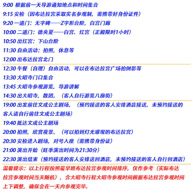一次有意义的差旅不应止于打卡拍照。本产品通过资深导游的生动讲述,将布达拉宫的建造传奇、五世达赖灵塔的珍宝、大昭寺文成公主带来的释迦牟尼像等故事娓娓道来,赋予景点鲜活生命。您带走的不仅是夜景美照,更是对藏文化、历史与信仰的理解,让短暂旅程转化为长久的精神财富,为后续工作注入新视角与灵感。