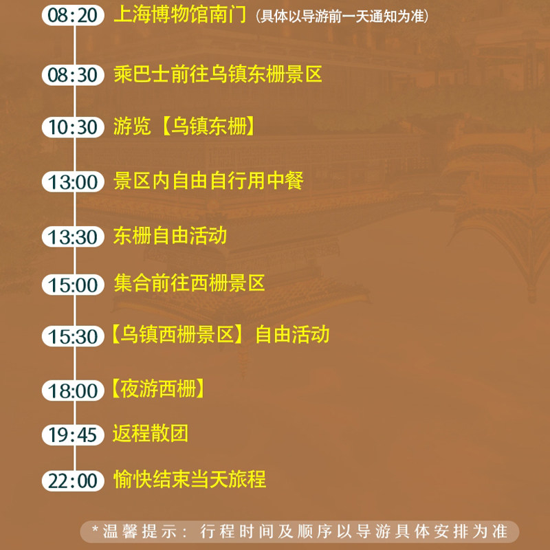 专为差旅人士设计的乌镇1日游产品,从杭州或上海出发,全程包车私家团,省去公共交通转乘烦恼。行程紧凑高效,上午出发、傍晚返程,完美适配商务间隙。包含东栅、西栅双景区门票及特色午餐,让您在有限时间内深度体验江南水乡韵味,兼顾工作效率与身心放松,是差旅途中理想的短途度假选择。