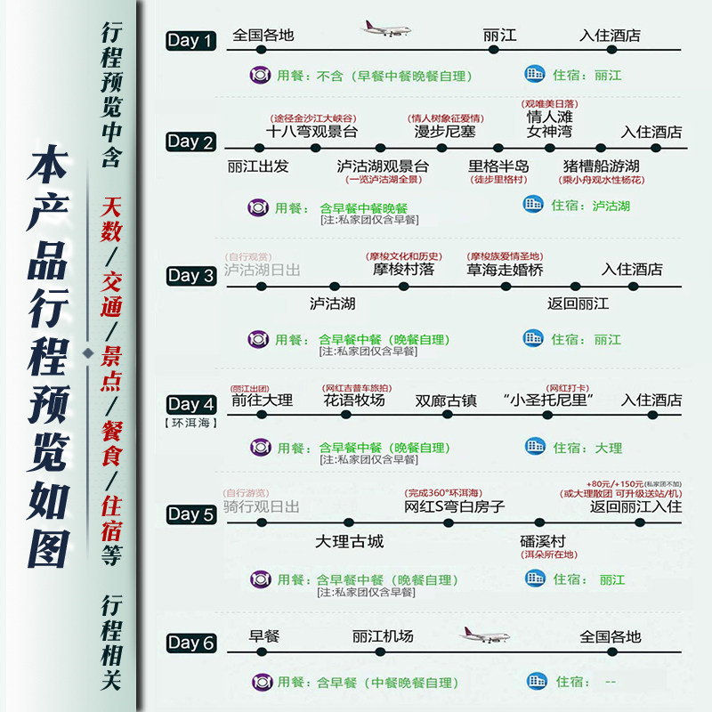 本线路支持1人独立预订,无需拼团等待,特别适合商务人士或独自出差后顺道度假的旅客。从丽江出发,串联大理、泸沽湖等经典目的地,行程安排紧凑而不失深度,兼顾效率与体验。无论您是临时起意还是提前规划,都能快速锁定席位,即刻启程,享受说走就走的差旅式度假。