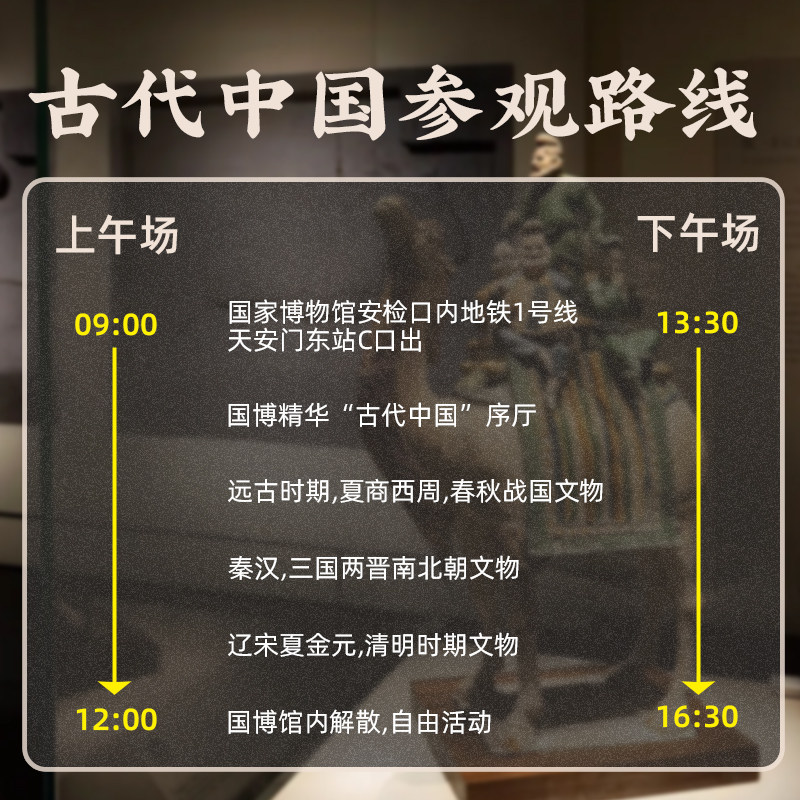 在北京出差或短暂停留期间,无需额外安排行程,即可利用半天时间参与中国国家博物馆的专业人工讲解服务。本产品专为差旅人士设计,灵活预约、1人可订,助您在紧凑日程中高效汲取中华五千年文明精华,将商务出行转化为兼具效率与深度的文化体验。