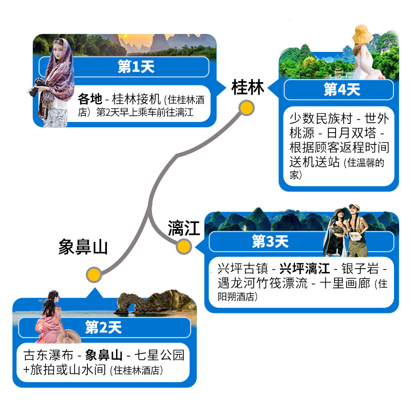 本行程巧妙串联广西两大热门城市——北海与桂林,特别适合差旅人士在公务间隙轻松切换度假模式。从北海出发或抵达,无缝衔接桂林山水精华,4天3晚紧凑安排兼顾效率与体验。无论是漓江竹筏、银子岩探秘,还是涠洲岛拾贝,都能在有限时间内深度感受广西自然与人文魅力,让差旅不再只是奔波,而是身心双重充电。