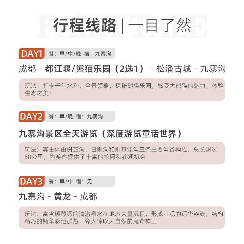 本行程专为差旅人士设计,从成都出发搭乘高铁快速抵达九寨沟,省去长途驾车疲劳,最大化利用有限假期。高铁班次稳定、准点率高,便于商务人士在完成工作后无缝衔接度假行程。三日两晚的紧凑安排既满足深度游览需求,又不影响返程工作节奏,是高效差旅与品质度假的完美结合。