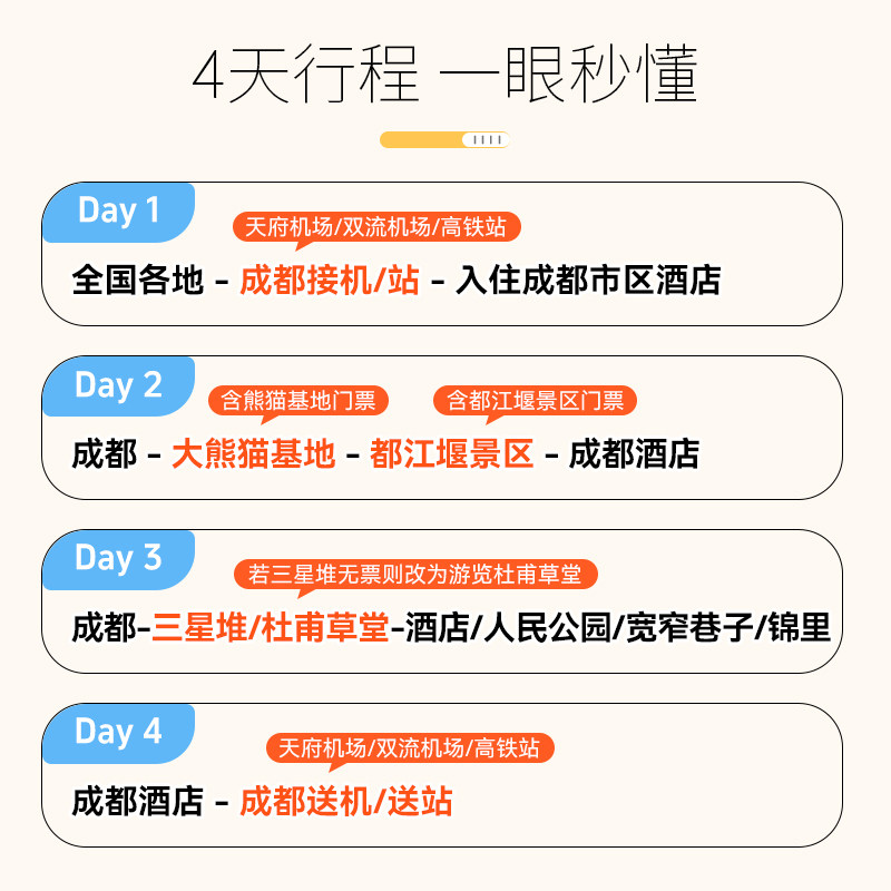 本行程支持1人独立预订,无需拼团等待,特别适合出差途中临时安排短途度假的商务人士。无论您是独自出差至成都,还是希望在繁忙工作后快速切换至休闲模式,都能即刻启程,省去协调多人时间的繁琐,真正实现“说走就走”的高效差旅体验。