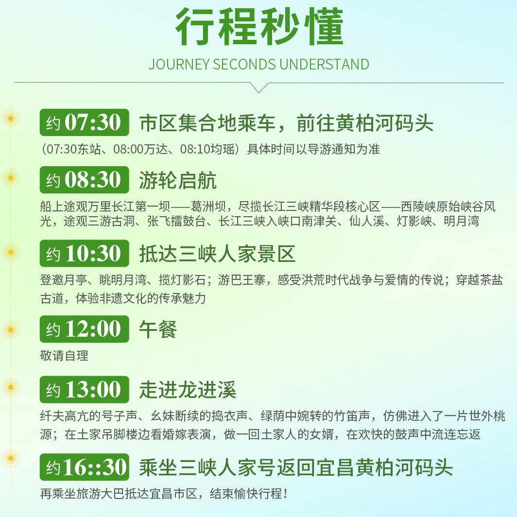针对商务差旅人士时间紧张、行程灵活的特点,本产品支持1人单独预订,无需拼团等待,极大提升出行效率。无论是临时出差顺道放松,还是短暂驻留宜昌的间隙安排一日游,都能即订即走,无缝衔接工作与休闲。特别适合独自出差的职场人士,在紧凑日程中轻松体验三峡人家的独特魅力,兼顾效率与身心放松。