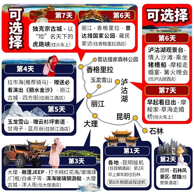 8天7晚的行程长度精准契合多数企业年假或调休周期,尤其适合利用周末+5个工作日的组合假期。无论您从天津、济南、合肥还是乌鲁木齐出发,均可高效利用有限假期,完成一次覆盖云南四大核心目的地(昆明、大理、丽江、香格里拉/泸沽湖)的全景之旅,最大化假期价值,避免“假没休好、玩没玩透”的遗憾。