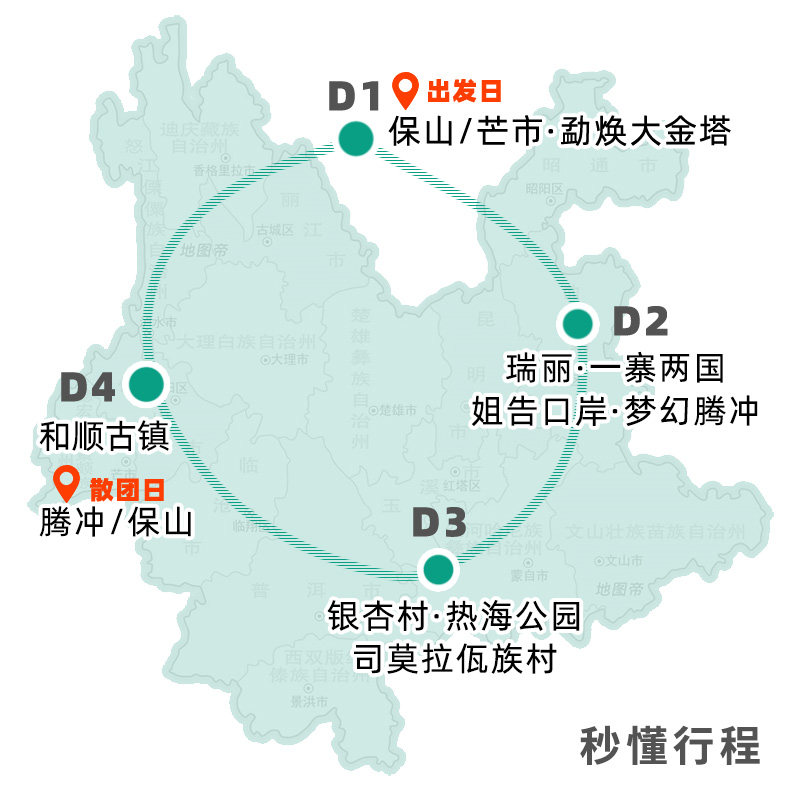 精心规划的4日行程高效覆盖滇西核心景点,从保山出发,经芒市、瑞丽至腾冲,无缝衔接银杏村、热海公园、和顺古镇、勐焕大金塔等标志性目的地。路线设计避免重复折返,最大化利用差旅碎片时间,既满足深度游览需求,又节省交通成本与精力。适合周末或小长假出行的商务人士,在有限时间内收获最大化的旅行体验。