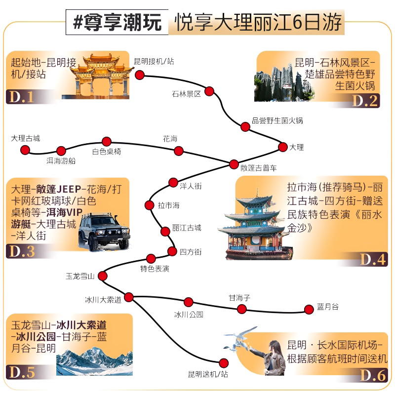 6天5晚的行程设计精准契合现代职场人的调休或周末+年假组合模式。例如周五下班后出发,下周一返岗,仅占用2天年假即可畅游昆明、大理、丽江、西双版纳四大目的地。高效串联多城精华,满足差旅族对时间利用率与旅行深度的双重需求。