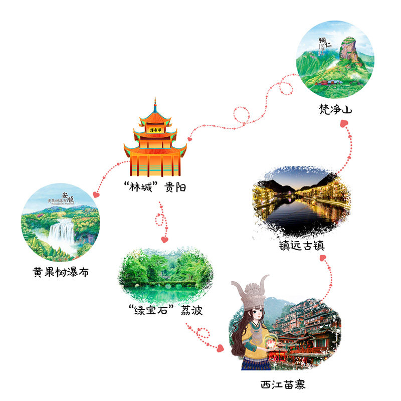 线路精心设计为贵阳—安顺(黄果树)—黔东南(西江)—黔南(荔波)—返程的顺时针环线,最大化减少回头路,节省交通时间。特别适合周末+年假组合出行的差旅人群,在5天内高效打卡贵州四大世界级旅游资源。