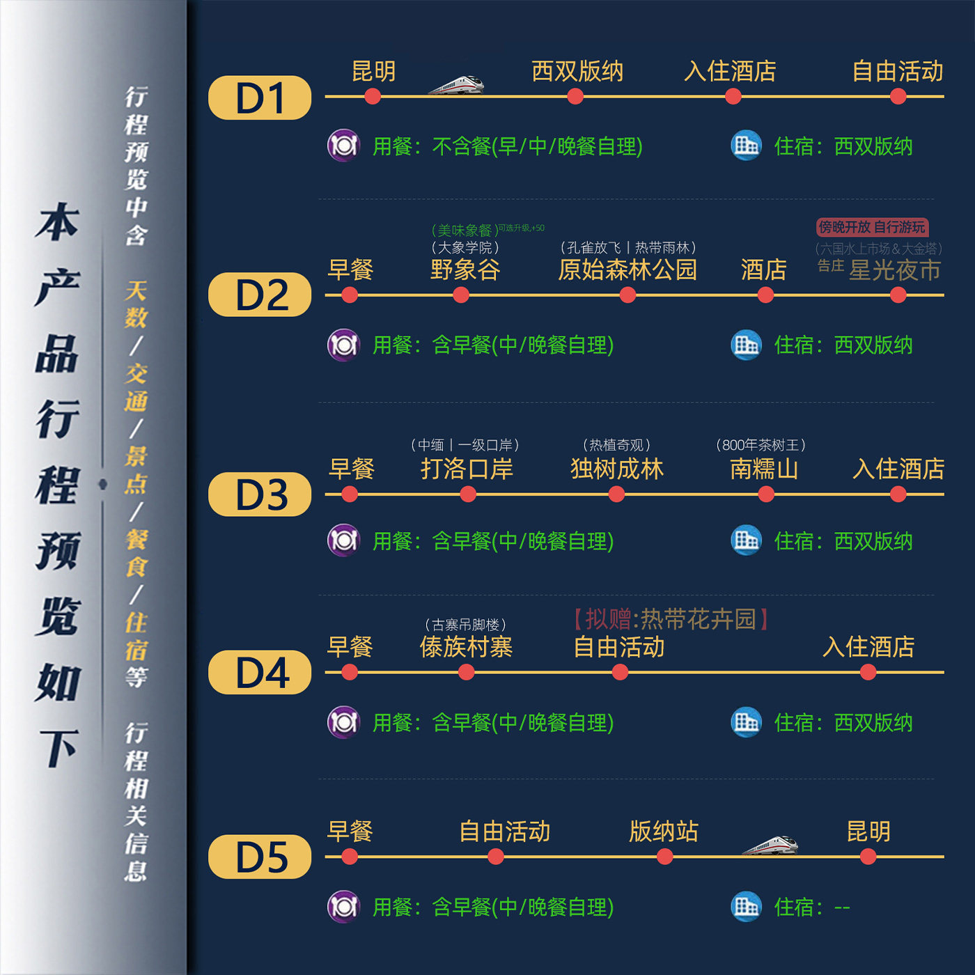 以“傣族文化+热带雨林”为主题精心设计5日行程,融合民俗、美食、生态与边境元素,形成鲜明记忆点。区别于常规观光,此类主题游能为差旅人士带来深度文化共鸣与独特谈资,无论是用于内部分享还是客户沟通,都能增强个人专业形象与故事感染力。