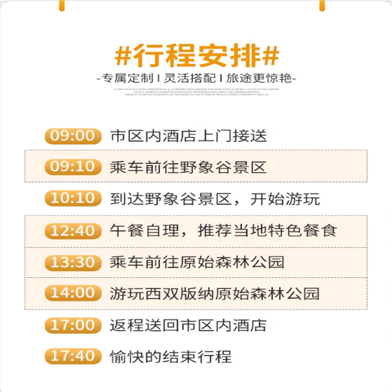 专为差旅人士设计的一日游路线,科学串联野象谷与原始森林公园两大精华景区,省去自行规划交通与门票的繁琐。上午观象、下午探林,傍晚即可返回市区处理公务或搭乘航班。全程无购物、无隐形消费,最大化利用有限假期,实现“半天工作+半天度假”的理想差旅平衡。