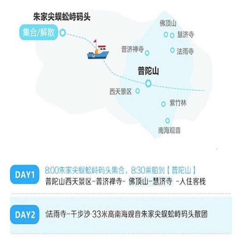 行程已包含景区门票及往返船票,免去差旅人士自行购票、排队候船的繁琐环节。从舟山出发直达普陀山,交通接驳顺畅,最大化节省宝贵时间。尤其适合仅有一两天空闲的商务旅客,无需操心细节,专注享受高品质人文度假体验。