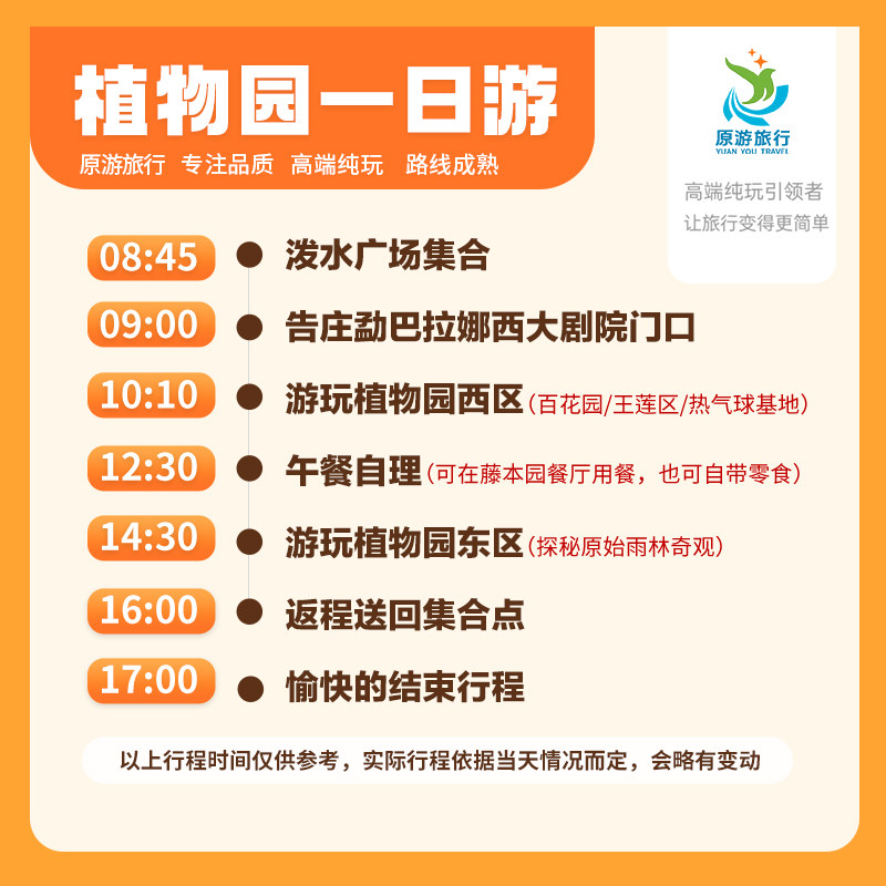 行程起点与终点均设于西双版纳市区,方便差旅人士直接从酒店或会议地点出发,无需额外交通周转。一日之内完成植物园探索、泼水体验、雨林漫步等多项活动,傍晚即可返回处理工作或搭乘航班。真正实现“上午开会,下午探秘雨林”的高效差旅生活模式。