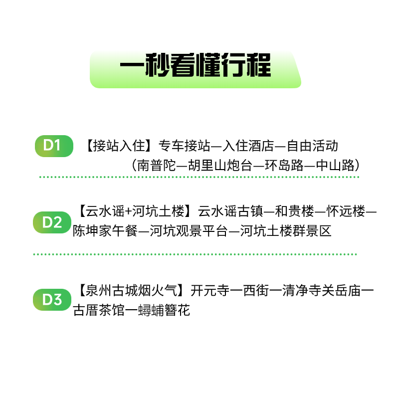 针对独自出差或临时调派的商务人士,本产品支持1人成行,无需拼团等待,随时下单即可启程。行程涵盖厦门至漳州、泉州的经典线路,将云水谣古村、土楼群与开元寺等标志性目的地一网打尽。差旅途中也能轻松享受高品质旅行服务,解决单人出行的住宿、交通与导览难题,让您的公务之旅更从容自在。