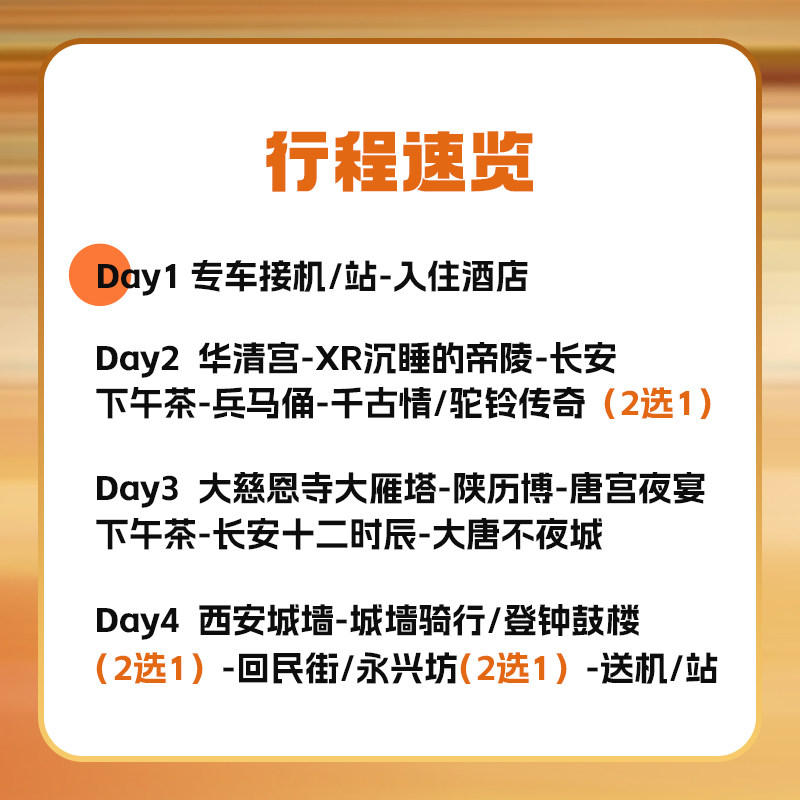 4天3晚私家团全程配备专属车辆与导游,避免公共交通转乘耗时,最大化利用有限差旅假期。从兵马俑到陕历博,从城墙到大兴善寺,点对点接送让您在紧凑日程中高效打卡核心景点,兼顾工作与休闲,真正实现‘出差+度假’双赢模式。