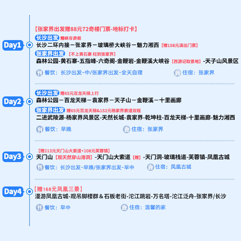 本产品以“人文+自然”为主题,串联长沙、张家界、湘西三地精华。差旅途中不仅能领略世界自然遗产张家界的奇峰异石,还能探访凤凰古城吊脚楼、名人故居等文化地标,实现商务出行与文化沉浸的双重价值,让旅程更有厚度。
