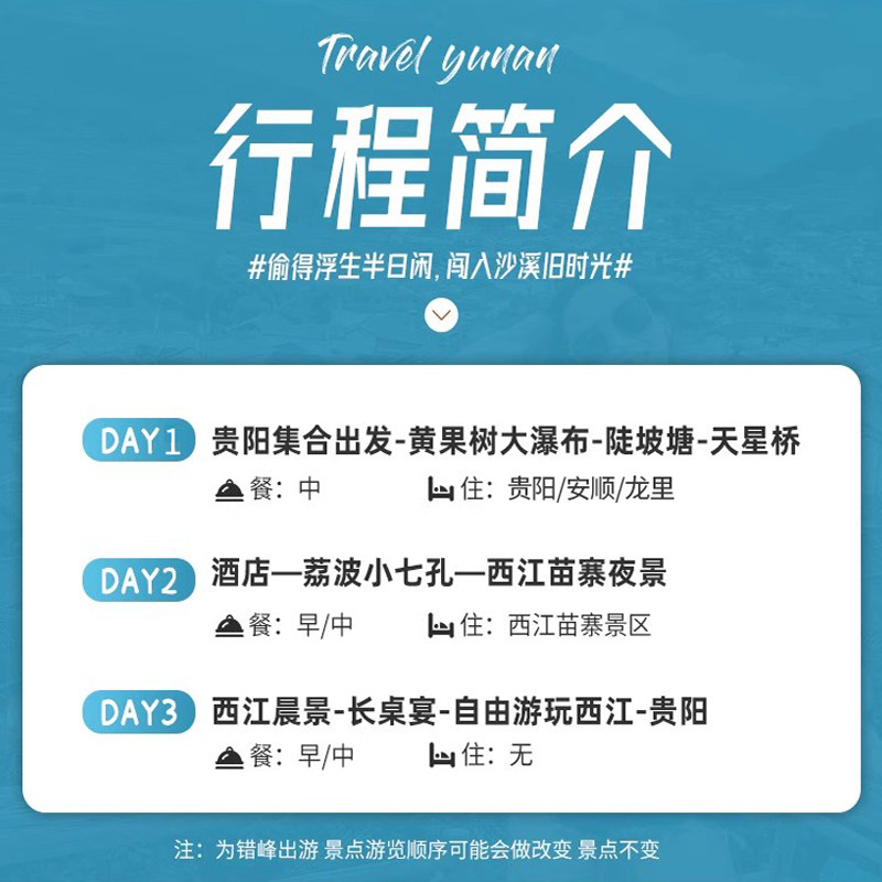 本行程专为差旅人士设计,从贵阳便捷出发,3天2晚高效覆盖安顺黄果树瀑布、黔东南西江千户苗寨及黔南荔波小七孔三大精华景点。路线紧凑合理,省去中转烦恼,最大化利用有限假期。全程交通、门票、住宿一价全包,无需额外操心,让商务出行之余也能轻松享受深度度假体验。