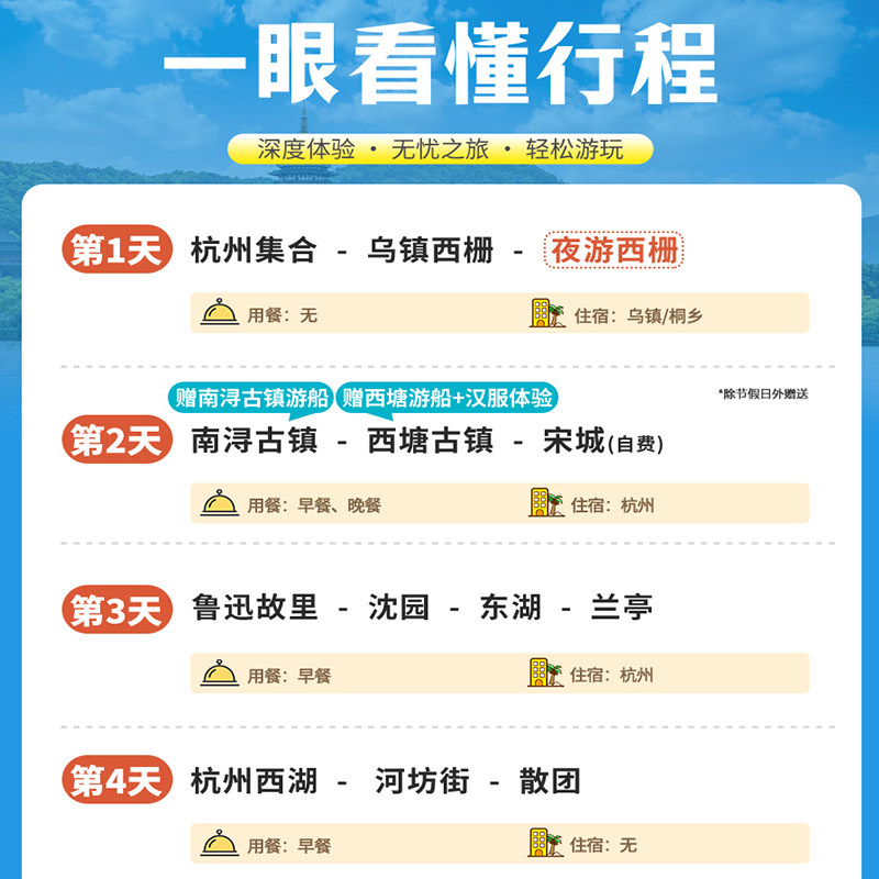 本行程支持单人预订,无需拼团等待,特别适合出差途中顺道度假或独自出行的商务人士。从杭州出发,轻松串联乌镇、西塘、南浔与绍兴四大江南水乡文化地标,行程紧凑却不仓促,既满足高效差旅节奏,又融入深度文化体验,让您的商务之旅兼具效率与诗意。