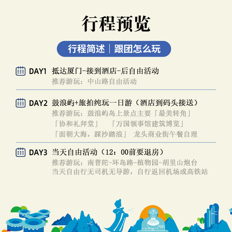 行程第三天设置为无导游、无司机的自由活动日,赋予差旅人士完全自主权。您可以睡到自然醒后漫步中山路品尝小吃,或前往曾厝垵选购伴手礼,亦可预约冲浪、巴士游览等标签内活动。这种‘半托管’模式兼顾服务保障与个人自由,尤其适合需要灵活处理临时工作或偏好自主探索的差旅群体,实现度假与事务处理的完美平衡。