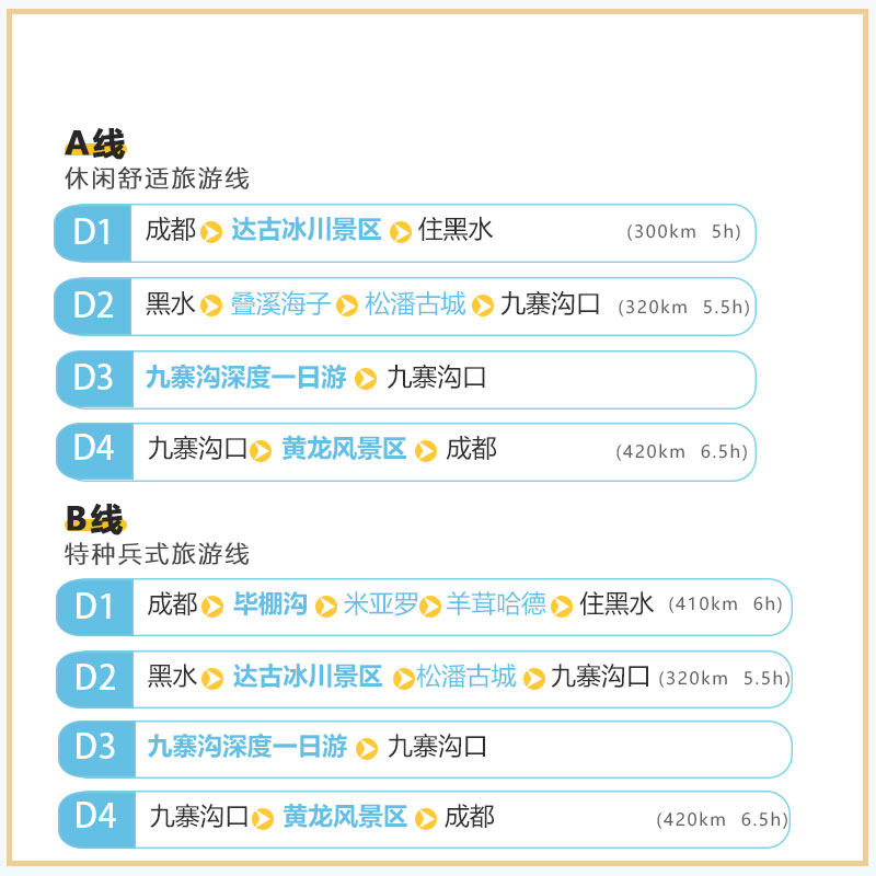 深知差旅时间宝贵,本行程坚持‘纯玩’原则,全程无任何购物店停留,杜绝无效耗时。所有路线经专业优化,串联九寨沟、黄龙、达古冰川等世界级景观,确保每一分钟都用于欣赏自然奇观或休憩恢复。高效动线设计,让短假也能收获深度体验。