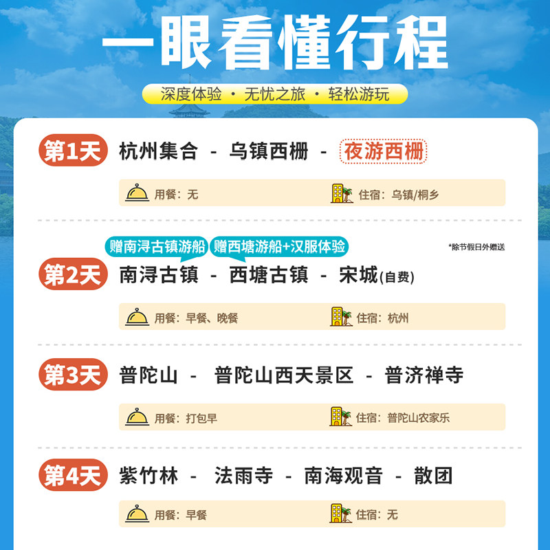 专为商务差旅人士设计,本行程从杭州出发,覆盖舟山普陀山、乌镇、西塘等经典目的地,全程无购物环节,节省宝贵时间。4天紧凑安排兼顾文化体验与休闲放松,适合出差间隙快速切换状态。无论是龙井御茶宴还是古镇夜游,都能在高效节奏中感受江南韵味,让差旅不再只是奔波,更是一场身心充电之旅。