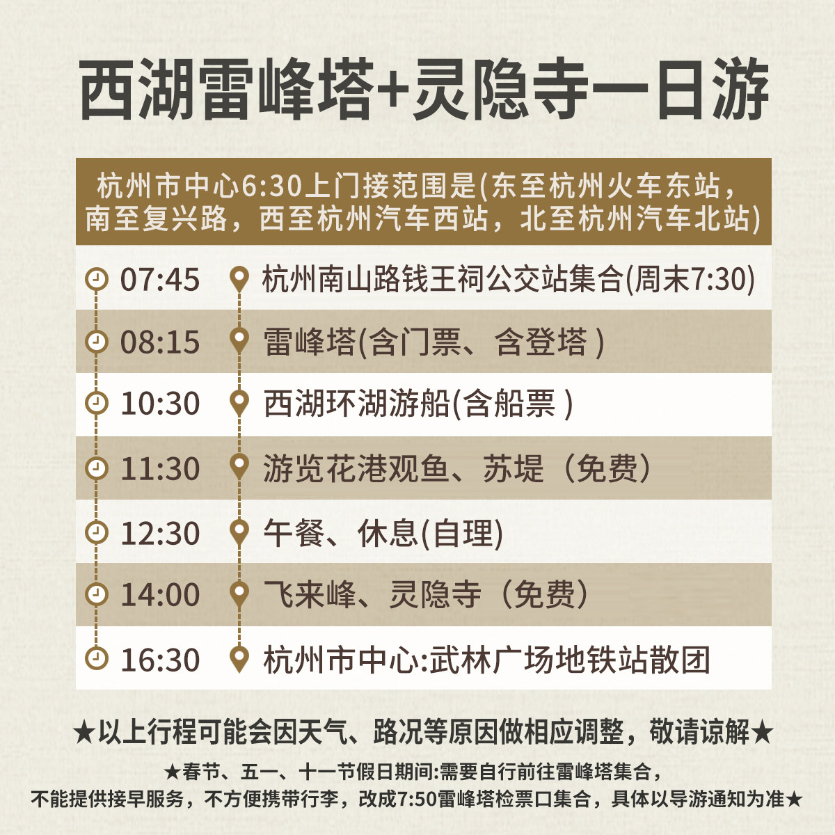 针对独自出差或临时调派的商务人士,本产品支持1人成行,无需拼凑同伴,极大提升差旅灵活性。无论您是上午会议结束还是傍晚航班前空闲,都能轻松加入当日小团,高效利用碎片时间游览西湖、灵隐寺等标志性景点。行程安排合理,交通接驳顺畅,免除独自出行的规划烦恼,让差旅中的短暂休憩变成一次文化沉浸之旅。
